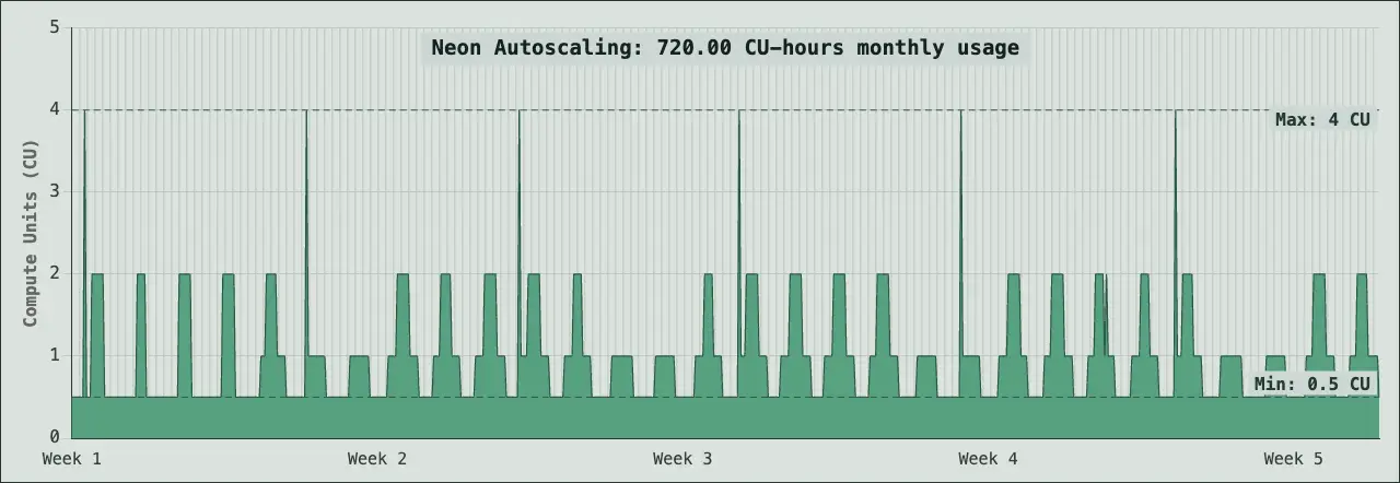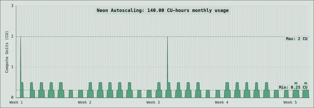 A databse using 140 CU-hours compute per month can scale to zero when idle, and start back up in 350ms when it's needed. When it's running it is set to a minimum size of 0.25 CU but can scale up to 2CU when needed.Low Load: