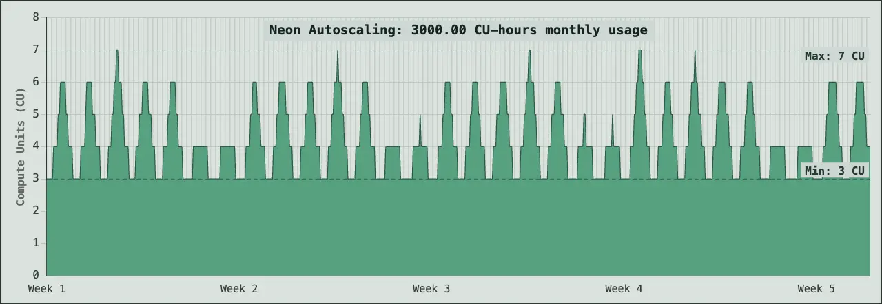 As an example, a database that is scaling between 3 CU and 7 CU will often use around 3000 CU hours in a month. This level represents production applications with sustained traffic, higher data volumes, and more complex queries requiring consistent compute resources.