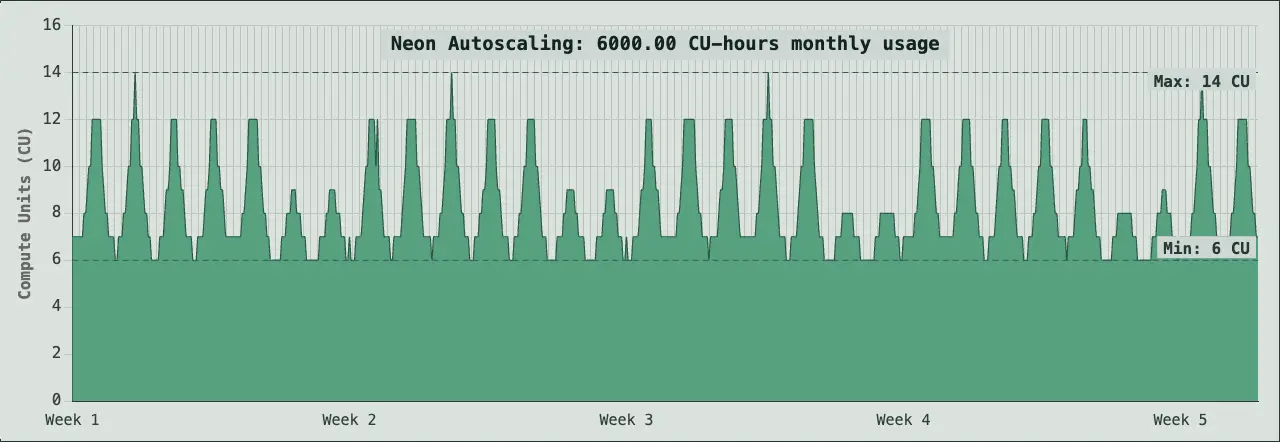 A database scaling between 6 and 14 CU can use in the range of 6,000 CU hours in a month. This is representative of large-scale production workloads with high traffic volumes, extensive datasets, and applications requiring significant compute capacity and storage.
